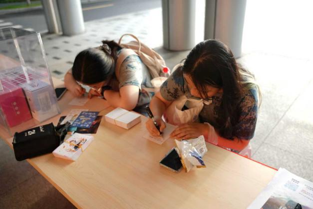 (图为志愿者摆摊现场) (图为新生为乡村孩子写明信片)