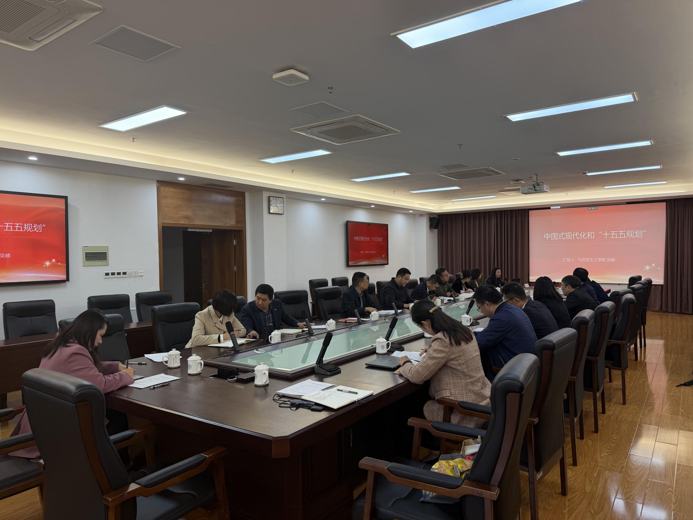 会上,马克思主义学院教师吴頔以《中国式现代化和“十五五”规划》为题作专题辅导报告。她指出,党的二十届四中全会是在我国迈向全面实现社会主义现代化关键阶段召开的一次重要会议,“十五五”时期是基本实现社会主义现代化的关键时期。她主要从“中国式现代化的内涵与特征、‘十五五’时期的历史方位与主要目标、十五五’如何实现中国式现代化的关键一跃?”三个方面进行了深入解读,带领与会人员集体进行了一次全面且深刻的理论学习。