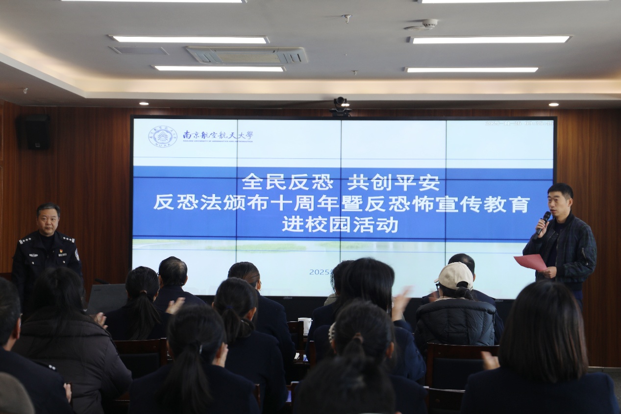 在《中华人民共和国反恐怖主义法》颁布十周年之际,为将安全防线筑在师生身边,让反恐意识融入日常生活,11月26日,学生处、后勤保障部、保卫处联合常州市公安局反恐支队在天目湖校区开展“全民反恐 共创平安”主题教育培训活动。本次培训特邀常州市公安局反恐支队副支队长闵晔祁警官做专题培训。活动由校保卫处副处长袁琪主持,学生处副处长、牧星学院副院长张建辉,及驻校区全体辅导员、宿舍管理员、保卫干部近60人参与培训。