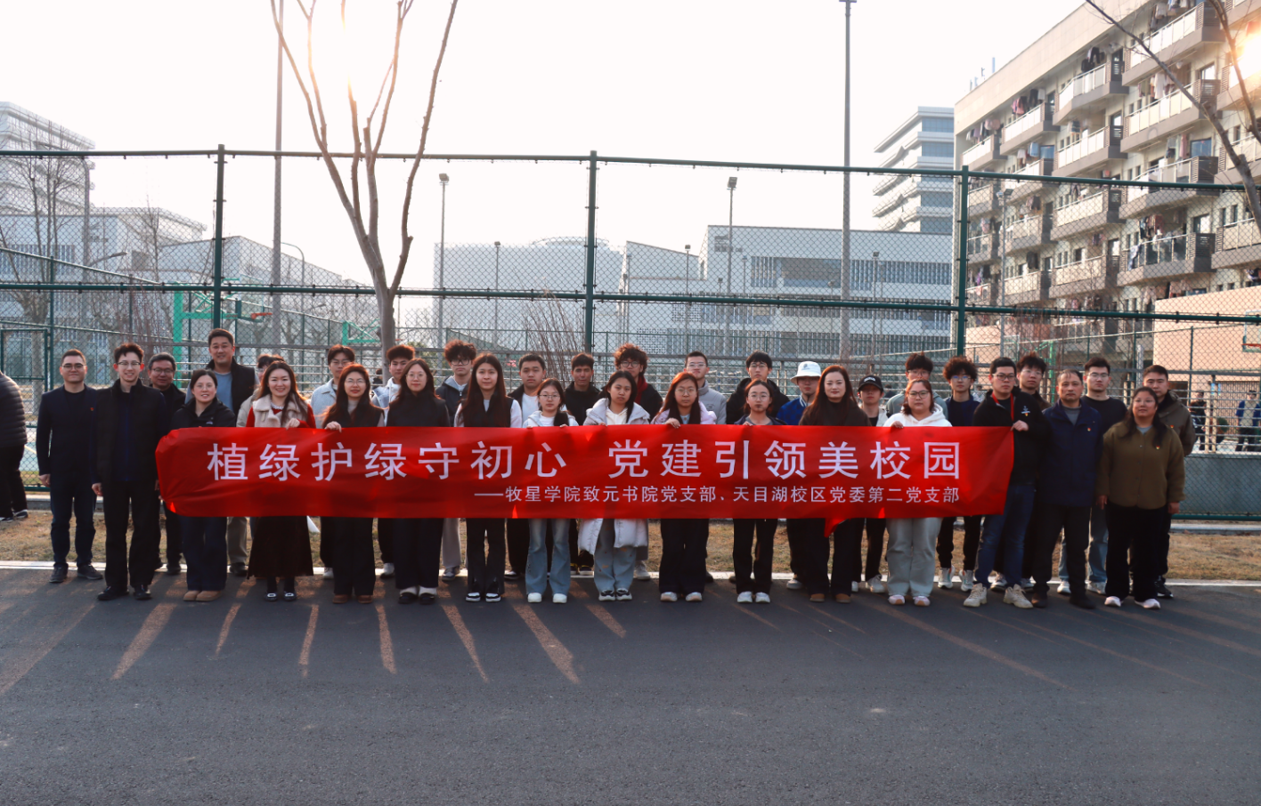 春风拂绿,草木萌新。在第48个植树节到来之际,为深入践行习近平生态文明思想,深化支部共建实效,强化党员责任担当与党组织凝聚力,天目湖校区党委第二党支部联合致元书院党支部,在校区B7学生公寓南侧开展“植绿护绿守初心 党建引领美校园”主题植树活动。全体党员踊跃参与,以实际行动为校园增绿添彩、共筑生态美景。天目湖校区管委会副主任于晓、致元书院执行院长王宁作为普通党员参加活动。