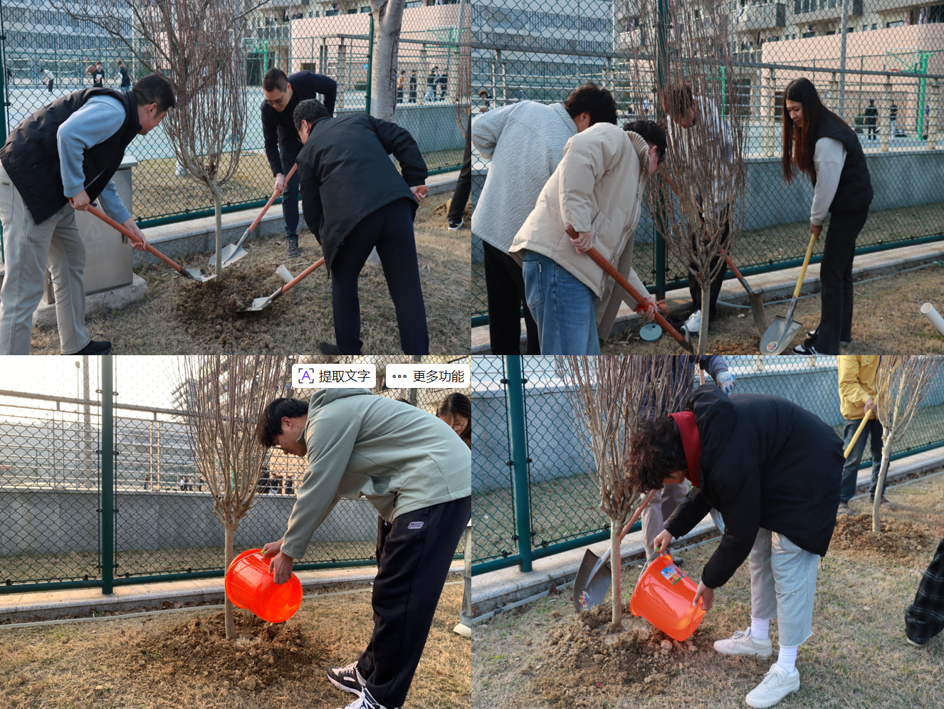 活动现场暖意融融、干劲满满。在工作人员的引导下,两个党支部的党员同志们分工协作、默契配合,有序投入植树劳作。大家挽袖挥锹、扶苗培土、围堰浇水,每一个环节都认真细致、规范有序。现场一派热火朝天的劳动景象,欢声笑语中,一株株新苗迎风挺立,为初春的校园增添了盎然生机与蓬勃活力。
